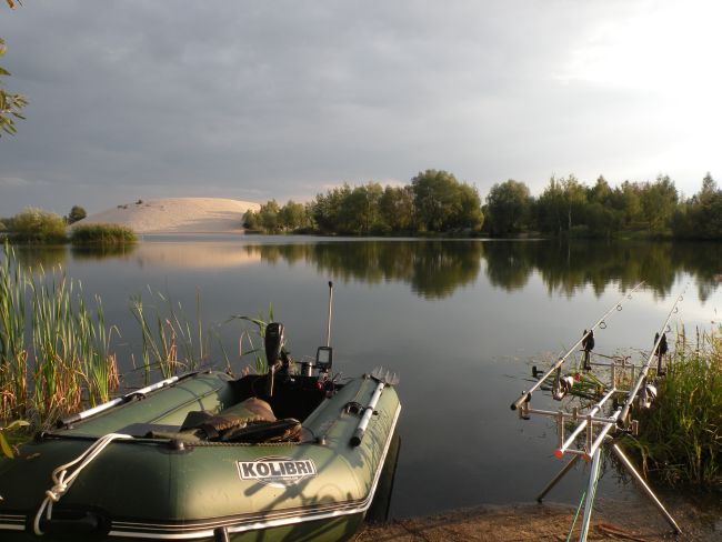 Docieramy do naszej zatoczki - wszystko jest ok. jedynie co troszkę mało miejsca na namioty także postanawiamy postawić je na górce na samej drodze. Przy okazji trzeba jeszcze wykonać mały drenaż i spuścić wodę z kałuży, żeby przejeżdżające za naszymi plecami auta nie pochlapały nam namiotów. Następnie rozkładanie namiotów i całe mozolne rozkładanie reszty majdanu. Przychodzi czas na spłynięcie miejsca pontonem i dokładne obadanie dna echosondą. Miejsce zapowiada się dobrze. Ehosonda pokazuje kilka naprawdę ciekawych miejsc. Wypłycenie ma 0,8m problem jest tylko taki, że bezpośrednie spadki są bardzo mocno porośnięte. Typujemy na początek dwa miejsca i stawiamy markery. Jedno ok. 4,5m wody koniec spadku górki i początek prostego dna, drugie w porośnietym rogu zatoczki na lekko ponad 5m. Strategie nęcenia mamy zupełnie odmienne. Na pierwsze nęcenie mojego miejsca lecą pellety: bloodworm, multiblend i halibut pokruszone kulki oraz konopia i kukurydza. Animal nęci swoimi sekretnymi składnikami.