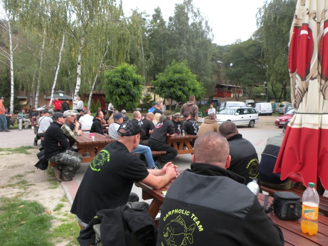 Oficjalne rozpoczęcie zawodów oraz losowanie stanowisk odbyło się na plaży głównej jeziora. W zawodach zaliczanych do eliminacji Polish Carp Masters wystartowało 25 ekip z całej Polski. Ja z Ryśkiem wylosowaliśmy stanowisko nr 10 ale po krótkiej konsultacji postanowiliśmy losować jeszcze raz i za drugim razem tym razem już ostatecznie wylosowaliśmy stanowisko 21, natomiast druga ekipa naszego teamu również po odrzuceniu miejsca z pierwszego losowania zakotwiczyła się na 14stce. Po rozjechaniu się na stanowiska, rozłożeniu gratów i postawieniu markerów w 3 różnych miejscach na różnych głębokościach przyszedł czas na odpoczynek i oczekiwanie pierwszego strzału. Brania doczekaliśmy się stosunkowo szybko ale niestety nie było ono karpiowe ale leszczowe.. Żeby nie dostać odleżyn od tego czekania na karpia udałem się w odwiedziny do kolegów z sąsiednich stanowisk, którzy jak się okazało - nie dość, że potrafili świetnie łowić to uwierzcie mi na słowo - bawić potrafili się równie świetnie. Przykładek niech będzie flaszka zakopana pod drzewem rok temu na poprzedniej edycji a odkopana i "spróbowana" w tym roku. Także zawody przebiegały w atmosferze świetnej zabawy i wspaniałej integracji. Nie było żadnych skarg czy protestów.