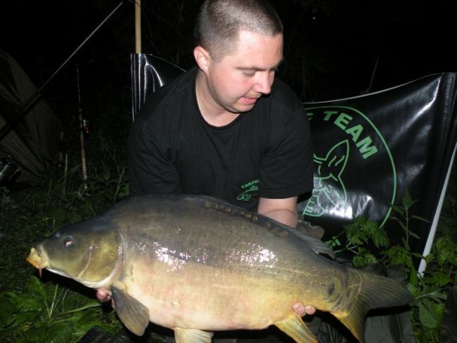 Mimo tego nie rezygnuje, na pierwszy ogień lecą kulki o smaku ananasa i truskawki , następnie pellet halibutowy i trochę allera o smaku ryby no i oczywiście kilka kilo kuku. Pierwsza nocka mija spokojnie nic się nie dzieje , zestawy zostały wywiezione na ok. 250m na blat o głębokości 180cm. Drugi dzień i noc tez bez pisnięcia, nic dosłownie nic. W trzeci dzień postanowiłem zmienić nieco taktykę i wykorzystać systemy PVA. Więc kruszerem szybko robie stick mix z kulek, pelletu, konopi, mleka w proszku , wszystko zalewam boosterem ananasowym i ładuje w siatki i worki. Ponownie wywożę zestawy na 250m i kładę punktowo na blacie. Wieczór mija przy piwku, chłopskim kociołku, i innych wysoko procentowych napojach. Zmęczony tą degustacja kłade się wygodnie na łóżku i lulu. Sen przerywa mi o 3 w nocy sygnalizator "ppppppiiiiiiiiiii" i caly czas jedzie , zrywam się w samych skarpetach z wyrka i krzyczę do kumpla " branie jest w koncu kur...a " dobiegam do stojaka zacinam i czuje, że po drugiej stronie to nie jest leszcz. I zaczęło się pompowanie z takiej odległości ale jakoś idzie - czuje, że ryba się nie opiera i nie ma potrzeby płynąć pontonem więc zwijam dalej , nagle 30 m od brzegu karp daje o sobie znać i ucieka w trzcinowisko , myślę sobie nie ma wyjścia i chlup do wody w skarpetach i ostatnich suchych spodniach. Po kilku minutach w podbieraku wylądował przepiękny zdrowiutki dziki karp. Moja wytrwałość została wynagrodzona, karp został zważony - miał równe 10kg i po sesji zdjęciowej oczywiście został wypuszczony. Tak więc wypad jak najbardziej udany, na pewno nie ostatni w to miejsce.