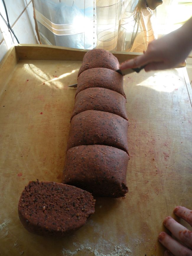 Jak mamy już wyrobione ciasto w formie wałka kroimy go na części, zawijamy w folie spożywczą i odkładany na ok. 30min do lodówki.